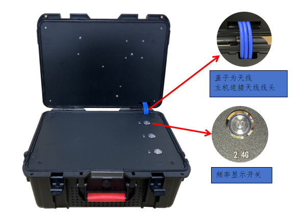 1、干擾遙控、圖傳信號,同時打開2.4G、5.8G開關;開始發(fā)射信號,天線面向無人機。