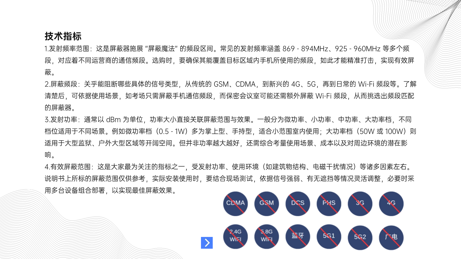 對于 WIFI 信號,主要是 2.4GHz 頻段(該頻段常見于早期的無線路由器,設(shè)備眾多,信道容易擁堵)和 5GHz 頻段(帶寬大,傳輸速度快,干擾相對較少,但信號覆蓋范圍有限,穿透力弱) 。藍(lán)牙信號的頻段則在 2.400GHz – 2.4835GHz,也難以逃脫屏蔽器的 “掌控” 。
