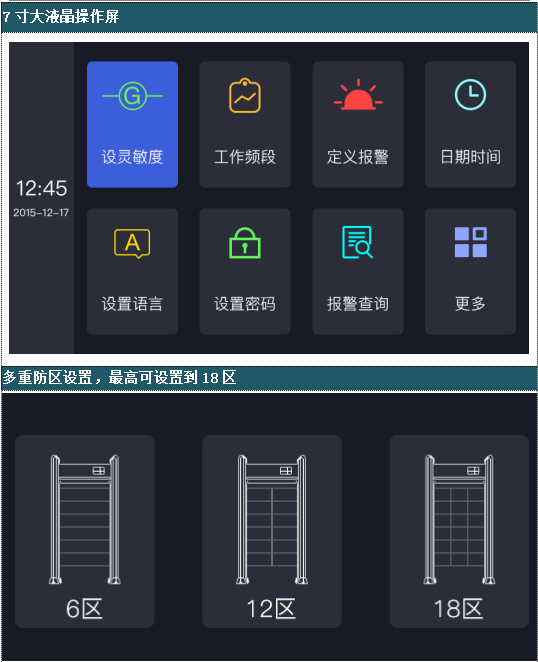 ★ 多防區(qū)技術(shù):18探測防區(qū),各探測防區(qū)靈敏度可任意調(diào)節(jié)(具備自適應(yīng)調(diào)節(jié)技術(shù)),并有高亮度LED報警部位指示,精確定位藏匿的違禁品部位;